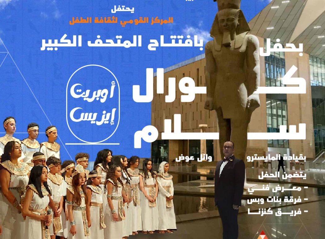 في إطار فعاليات وزارة الثقافة برعاية الدكتور أحمد فؤاد هنو وزير الثقافة، وإشراف أد.أشرف العزازي أمين عام المجلس الأعلى للثقافة، يقيم المركز القومي لثقافة الطفل برئاسة الكاتب محمد ناصف، احتفالية بمناسبة افتتاح المتحف المصري الكبير تحت شعار “مصر عادت شمسك الذهب”، وذلك بالحديقة الثقافية للأطفال مساء يوم الخميس ٦ نوفمبر ٢٠٢٥ الساعة ٦ م.