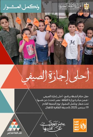 في إطار فعاليات وزارة الثقافة برعاية الدكتور أحمد فؤاد هنو وزير الثقافة، وإشراف أد.أشرف العزازي أمين عام المجلس الأعلى للثقافة يقيم المركز القومي لثقافة الطفل برئاسة الباحث أحمد عبد العليم حفل ختام أنشطة برنامج ” أحلى إجازة الصيفي ” ضمن مبادرة وزارة الثقافة ” مصر تتحدث عن نفسها ” تحت شعار “ونكمل المشوار” يوم الجمعة القادم ١٩ سبتمبر ٢٠٢٥ بالحديقة الثقافية للأطفال بإدارة الباحثة ولاء محمد