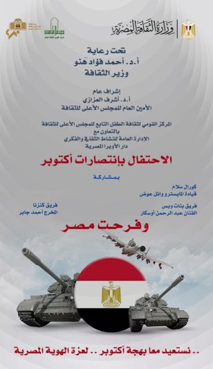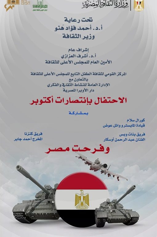 في إطار فعاليات وزارة الثقافة برعاية الدكتور أحمد فؤاد هنو وزير الثقافة، وإشراف أد.أشرف العزازي أمين عام المجلس الأعلى للثقافة، يحتفل المركز القومي لثقافة الطفل بذكرى نصر أكتوبر المجيد على مسرح معهد الموسيقى العربية احتفالاً بنصر أكتوبر المجيد تحت شعار “وفرحت مصر”، وذلك يوم الأربعاء ٢٩ أكتوبر الساعة ٧ م.