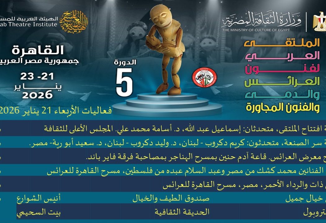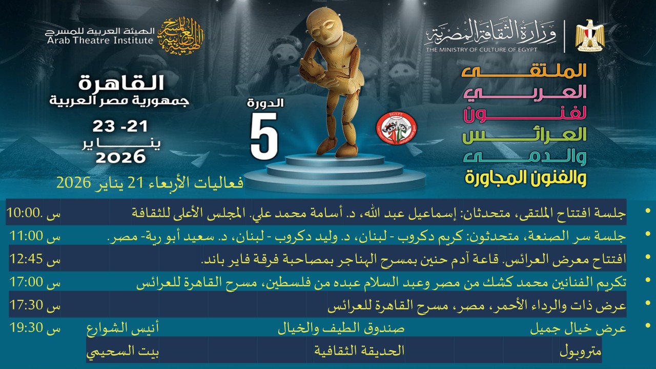 في إطار فعاليات وزارة الثقافة برعاية الدكتور أحمد فؤاد هنو، وإشراف أد.أشرف العزازي أمين عام المجلس الأعلى للثقافة، يشارك المركز القومي لثقافة الطفل برئاسة الكاتب محمد ناصف، التابع للمجلس، في افتتاح الملتقى العربي لفنون العرائس والدمى والفنون المجاورة، وذلك بتقديم عرض صندوق “الطيف والخيال” على مسرح الحديقة الثقافية للأطفال بالسيدة زينب بإدارة الباحثة ولاء محمد، مساء اليوم الأربعاء ٢١ يناير ٢٠٢٦ الساعة ٧.٣٠م.