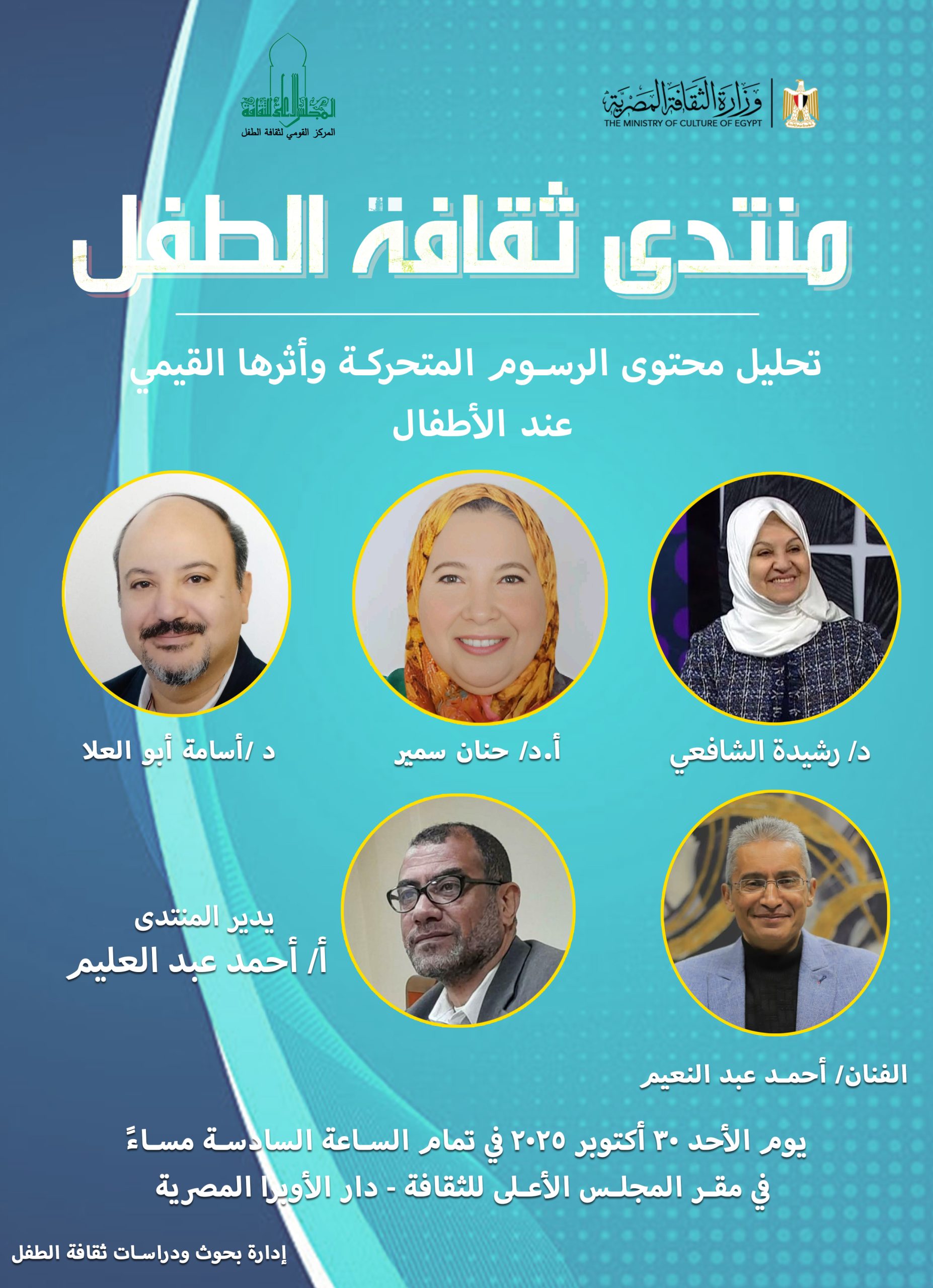 تحت رعاية الدكتور أحمد فؤاد هنو وزير الثقافة، وإشراف أد.أشرف العزازي أمين عام المجلس الأعلى للثقافة، يقيم المركز القومي لثقافة الطفل التابع للمجلس منتدى ثقافة الطفل بعنوان “تحليل محتوى الرسوم المتحركة وأثرها القيمي عند الأطفال”، وذلك يوم الخميس القادم الموافق ٣٠ أكتوبر بالمجلس الأعلى للثقافة في تمام الساعة السادسة مساءً.