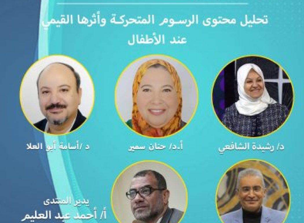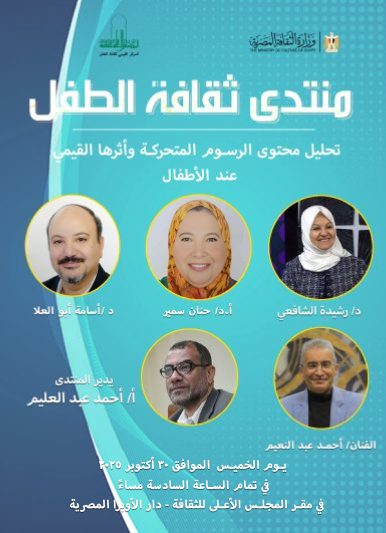 تحت رعاية الدكتور أحمد فؤاد هنو وزير الثقافة، وإشراف أد.أشرف العزازي أمين عام المجلس الأعلى للثقافة، يقيم المركز القومي لثقافة الطفل التابع للمجلس منتدى ثقافة الطفل بعنوان “تحليل محتوى الرسوم المتحركة وأثرها القيمي عند الأطفال”، وذلك يوم الخميس القادم الموافق ٣٠ أكتوبر بالمجلس الأعلى للثقافة في تمام الساعة السادسة مساءً.